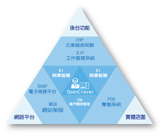 OpenClever中文名字為開雲寶典,是一套七合一的商業軟體。結合WEB-網站架設、SHOP-電子商務平台、POS-零售系統、